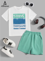 Elevate his daily adventures with the Atheno “Transcend” Set. This coordinated two-piece outfit combines a modern aesthetic with all-day comfort. Featuring a crisp white crew-neck t-shirt with a bold, pixel-style motivational graphic and matching seafoam green relaxed-fit shorts, it’s designed for the boy who is always on the move.